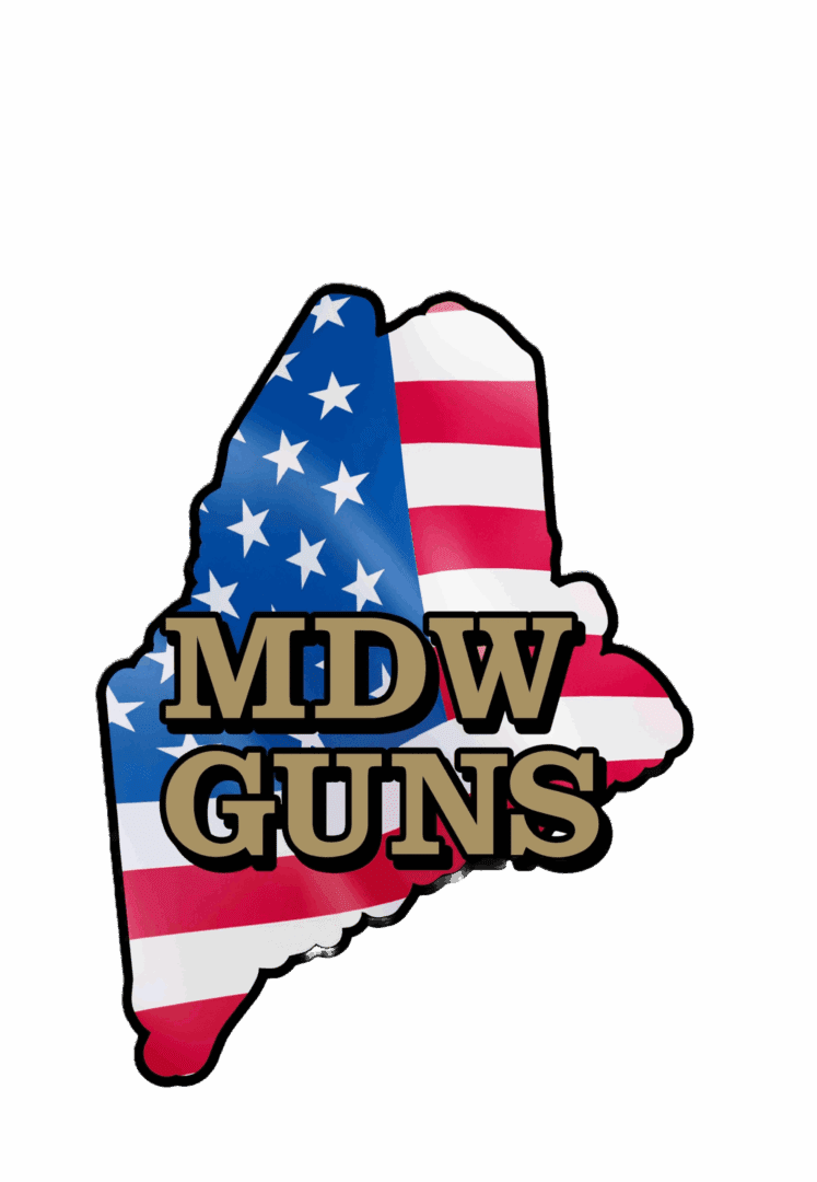 Logo of MDW Guns shaped like Maine with an American flag background.